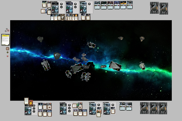 In the second round, my Demo and Interdictor were out of range and he was able to wait me out. I considered jumping Demo forward to hit the Mon Karren (and should have), but I decided to use the asteroid as a potential obstruction and to really punish him if he elected to ram Demo as a finishing move. Unfortunately, he was able to hit my front arc and crawl forward into medium range while maintaining an unobstructed front arc shot. Because my Rogues were out of position, only Maarek was able to put any damage on the MK. I blundered in positioning here and misjudged distance for Jendon. I turned my Gozanti slightly toward the left (should have gone straight) and this put Jendon out of activation range for the next round and also put the Goz on a ramming course toward that asteroid. This was the game-deciding blunder on my part. The Liberty managed to shave off two shields and the evade token from Demo. His CR90s played it VERY safe. Here is the opening board state on turn 3: